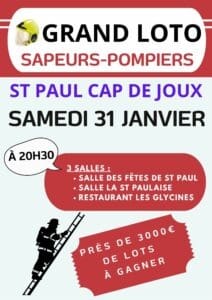 - Samedi 31 janvier – 20h30 – LOTO des Pompiers – à la salle des fêtes de Saint Paul Cap de Joux
